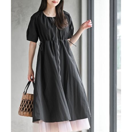 バルーンスリーブフロントZIPナイロンワンピース