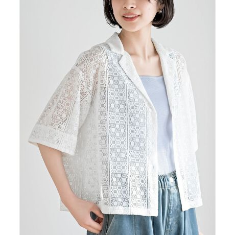 透け感のあるレースで仕立てたさわやかなシャツブラウス。
