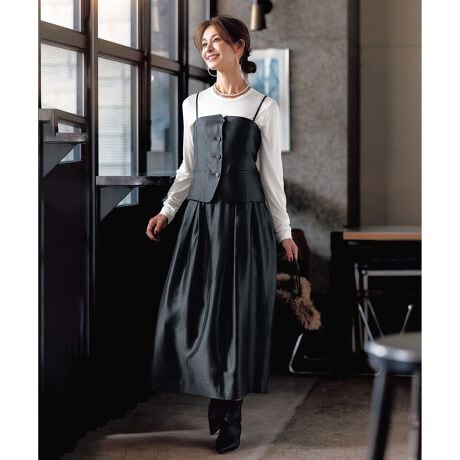 ・ビスチェフロントのボタンのマニッシュなデザイン。後ろはシャーリングになっているためコンパクトながらストレスフリーな着心地です。さらに肩紐は取り外し可能なのでインナーに合わせて気合わせを楽しめます。・スカートコクーンシルエットが新鮮なスカートはタックで自然とお腹周りをカバー。後ろウエストはゴム仕様で着心地の良さも叶います。・インナーレイヤードしてももたつかないすっきりとしたサイズ感。袖口でクシュっとたまる長めの長さがポイントです。