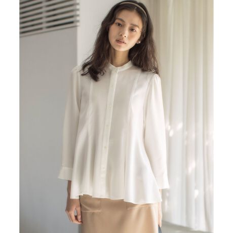 ■デザインバンドカラーの切り替えからフレアーを出したペプラムシルエットのシャツブラウスは体形をカバーしつつ、様々な骨格にも合うように設計しました。袖はボリュームのある9分袖で1枚着でもサマになるデザインです。ペプラムフレアーはヨコに切り替えがないのでボトムインのスタイリングも可能。さらに、ぺプラムフレアーをニットの裾から出してレーヤードアイテムとして、Tシャツの羽織として、これ一枚あればオールシーズン大活躍間違いなしのアイテムです。