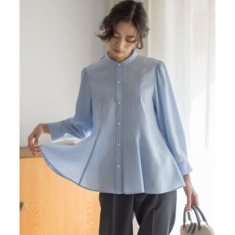 ■デザインバンドカラーの切り替えからフレアーを出したペプラムシルエットのシャツブラウスは体形をカバーしつつ、様々な骨格にも合うように設計しました。袖はボリュームのある9分袖で1枚着でもサマになるデザインです。ペプラムフレアーはヨコに切り替えがないのでボトムインのスタイリングも可能。さらに、ぺプラムフレアーをニットの裾から出してレーヤードアイテムとして、Tシャツの羽織として、これ一枚あればオールシーズン大活躍間違いなしのアイテムです。