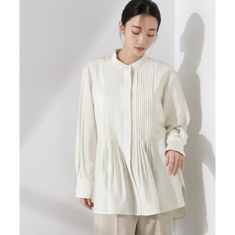胸元に入った細かいピンタックデザインが目を惹く上品な印象のシャツブラウス。ミドル丈なので、裾が程よくフレアになりインでもアウトでも一枚でしっかりと決まるアイテムです。