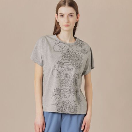 ブランドオリジナルのバイブリーフラワープリントを光沢感のある手法でプリントしたTシャツです。白には箔プリント、グレーには黒のフィルムプリントを施しています。長めの着丈で、コーディネートの汎用性が高いアイテムです。