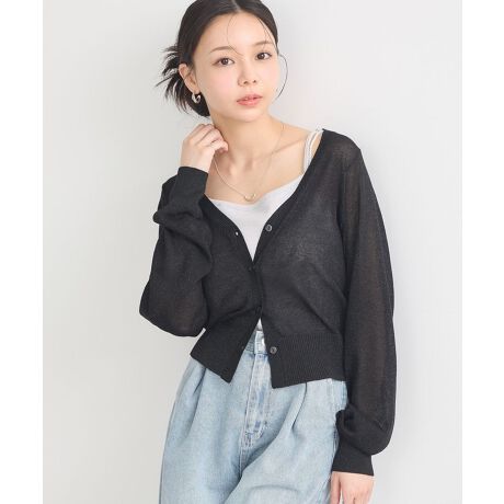 ラメ&シアー素材が上品なスタイリングを後押しするデザインカーディガン。トレンドのややショートな丈感で幅広いボトムとバランス良く合わせていただけます。深めのVネックが首周りや鎖骨ラインをきれいに魅せてくれるのも嬉しいポイント。さっと羽織るだけで季節感のあるコーディネートが完成するおすすめのアイテムです。
