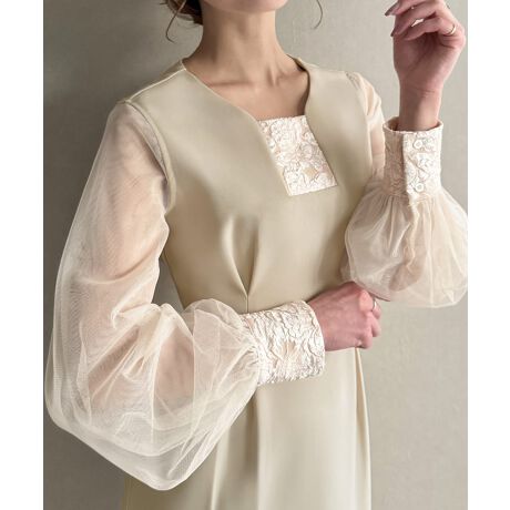 チュールスリーブ異素材ドッキングタックワンピース