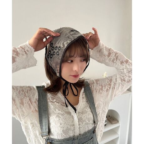 [型番:37-1782]☆抜け感たっぷりのバブーシュカ☆*POINT*・ボタニカルな刺繍をほどしたチュール生地で雰囲気◎・子供っぽくなりすぎないモノトーンカラーと素材感。・髪に馴染みやすいシアー感がポイント。※ヘアピン、アクセサリーなどへの引っ掛けにご注意ください。