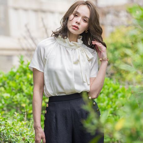 ネックにたっぷりとギャザーを入れた華やかブラウス。