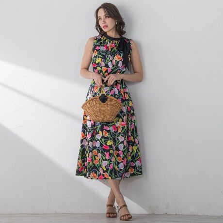 多色のチューリップを使用した作品をプリントした上品なボウタイワンピース。