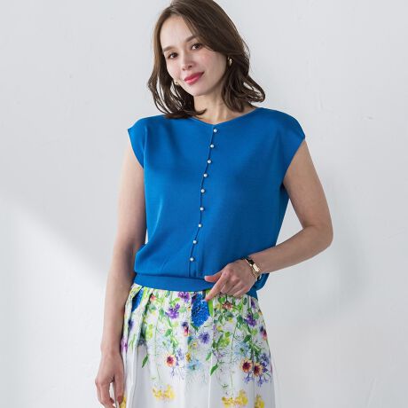 シンプルなVネックと、クルーネックにパール装飾、前後2wayでお楽しみいただけます。