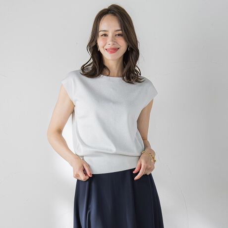 光沢感が美しい素材で編みあげたフレンチスリーブニット。