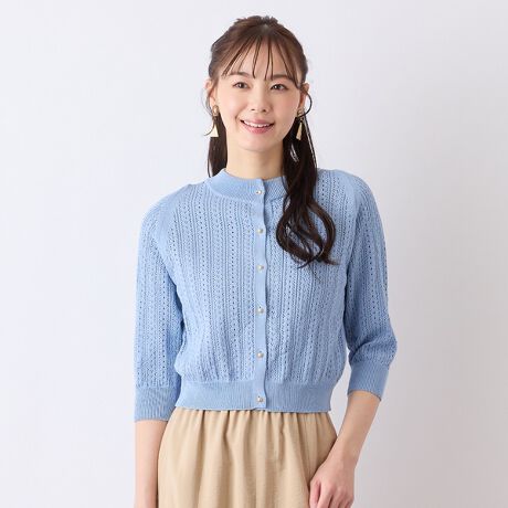 ドライタッチで清涼感のある綿100%糸を使用したニットボレロ。コンパクトな着丈に小さ目のボタンがアクセントに。