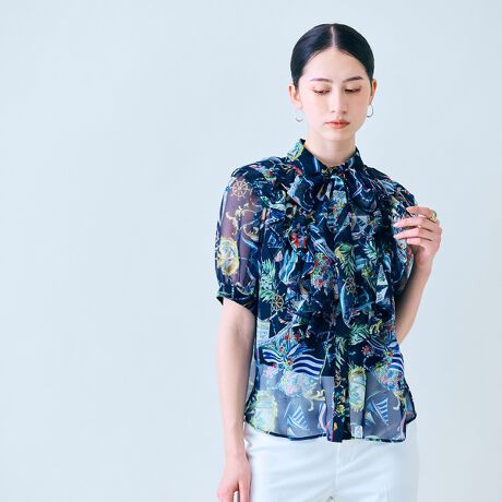 ・鮮やかなカラーリングが目を惹くマリンプリントのブラウス。