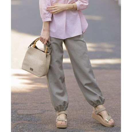 ■デザインワイドストレートのベイカーパンツ。カジュアル感の強いデザインですが、程よく肌から離れて落ちる素材感とゆとりのあるワイドシルエットが、大人の女性らしいきれいめなカジュアルボトムスに仕上がっています。裾は紐で絞ることができ、紐は裾の内側に収納し、真っ直ぐに伸ばした状態では表から見えない仕様になっています。トップスやシューズに合わせてシルエット変化を楽しめるパンツです。