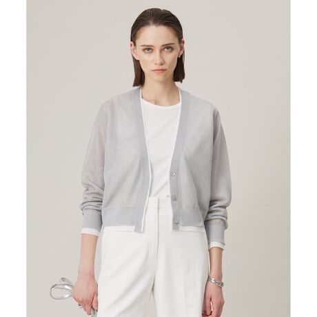 ■デザイン異なる色のカラーを重ね、2色のシャンブレー感が楽しめるレイヤードカーディガン。表と裏を配色にし2枚を一緒に編立てる天竺袋組織で編立てているので、上品なシアー感と美しいフォルム、動きに合わせてシャンブレー感が生まれ、エレガントモードに見せてくれます。二重前立ても同様に色をレイヤーし、表から釦が覗かないよう比翼仕立てにし細部にも拘りました。シャープなVネックラインでシックにハンサムに全体をまとめてくれます。パンツコーディネートできりっとハンサムに、またシンプルなワンピースにさらっと羽織って、きらめきをプラスしていただくスタイリングもおすすめです。