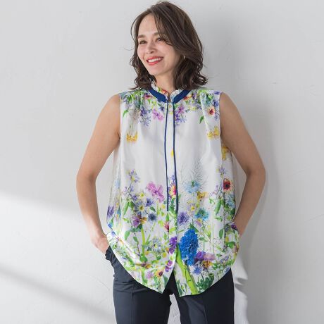花々がまるで花束のように繊細に咲き誇る作品をプリントしたボウタイブラウス。