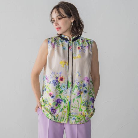 花々がまるで花束のように繊細に咲き誇る作品をプリントしたボウタイブラウス。