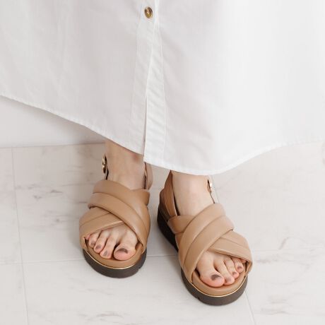 クロスベルトでしっかりと足をホールドし、中底のフットベットが足裏にフィットします。ベルトの中にクッションが入ったパデットデザインは、見た目だけでなく履き心地でも柔らかく快適さを叶えたアイテム。 しっかりと弾力がありつつも軽量なソールとクッションの効いたインソールで、日常使いにぴったりな一足です。