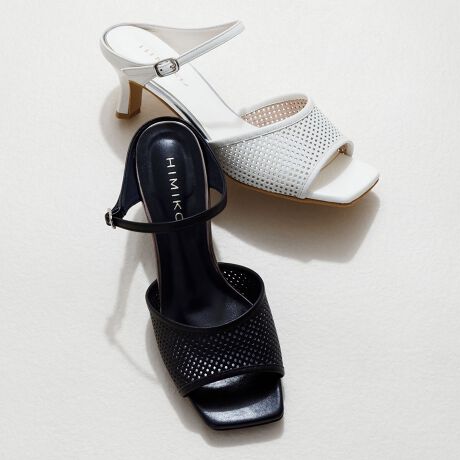 上質なレザーにパンチング加工を施したヒールミュールサンダル。シアー感を本革で表現したHIMIKOオリジナルレザーを使用しています。