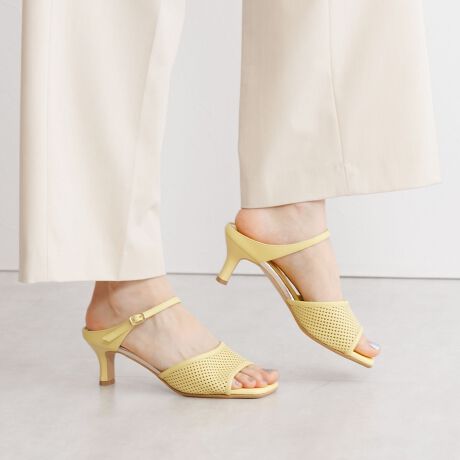 上質なレザーにパンチング加工を施したヒールミュールサンダル。シアー感を本革で表現したHIMIKOオリジナルレザーを使用しています。