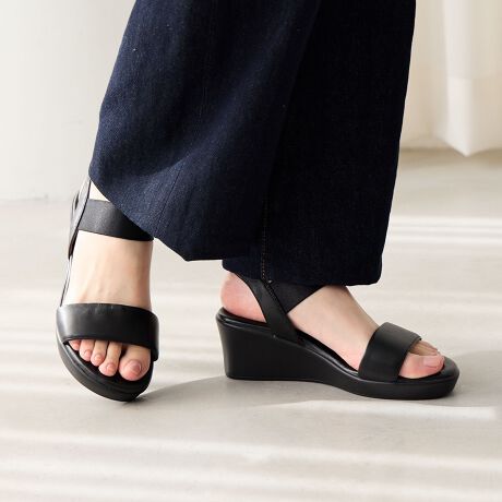 ベルト部分は上品な艶感のゴム素材を使用し、さっと簡単に着脱できます。 甲部分、かかとベルト部分にはクッションを搭載し、足当たりも柔らかく仕上げました。ソールと一体のウェッジヒールは軽量でカエリも良く、ストレスのない履き心地。 定番のブラック、トレンドを押さえたシルバー、パイソン柄の型押しレザーが目を引くDブラウンの3色展開です。