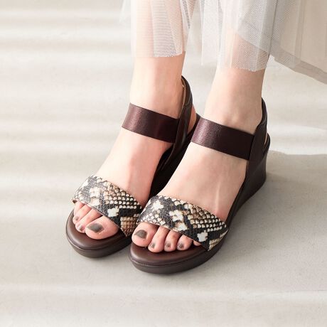 ベルト部分は上品な艶感のゴム素材を使用し、さっと簡単に着脱できます。 甲部分、かかとベルト部分にはクッションを搭載し、足当たりも柔らかく仕上げました。ソールと一体のウェッジヒールは軽量でカエリも良く、ストレスのない履き心地。 定番のブラック、トレンドを押さえたシルバー、パイソン柄の型押しレザーが目を引くDブラウンの3色展開です。