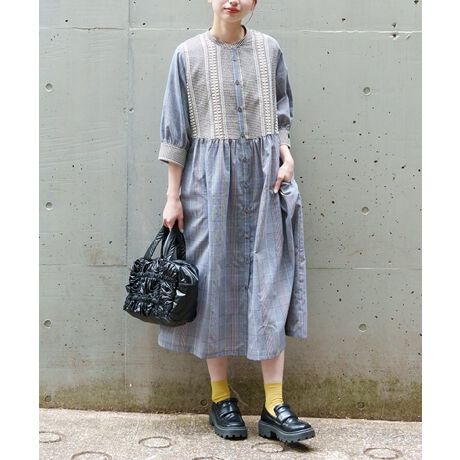2種類のチェック生地をミックスしてバンドカラーワンピースを作りました。