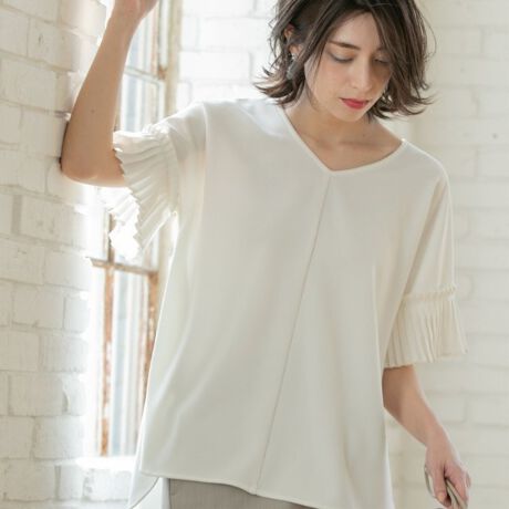 ・お袖に別素材のプリーツデザインをドッキングした、きれいめに着られるカットソープルオーバー。