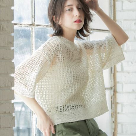 ボクシーなシルエットがポイントのメッシュ編みニットトップス