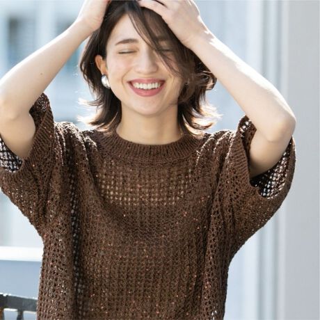 ボクシーなシルエットがポイントのメッシュ編みニットトップス
