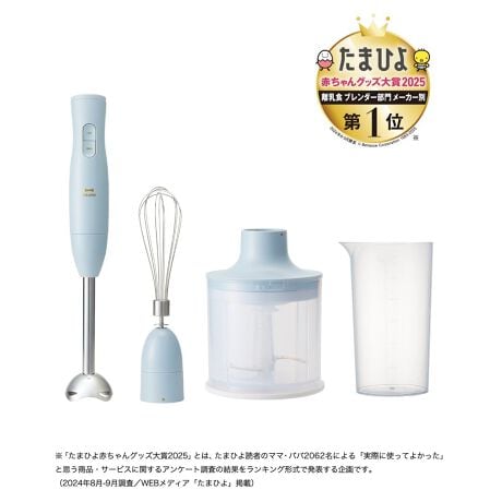 お料理も離乳食も!家事ラクをかなえるハンドブレンダー - つぶす・混ぜる・刻む・砕く・泡立てる、1台5役のハンドブレンダーがさらにつかいやすく!付属の電子レンジ対応チョッパーボトルとブレンダーカップを使えば、下ごしらえからそのまま加熱調理までおまかせ。火を使わず、洗い物もぐっと減って調理がスムーズに進みます。食洗機対応(一部パーツ)で、後片付けやお手入れも簡単。スリム&コンパクトなデザインと豊富なアタッチメントで、毎日のお料理からスイーツ、離乳食まで幅広く対応。いつもの家事がもっと愉しく、ずっとラクになる頼もしいアイテムです。
