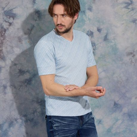 膨れ編みで表現したメランジ調ランダムボーダー柄をバイヤス使いしたVネック半袖プルオーバーになります。