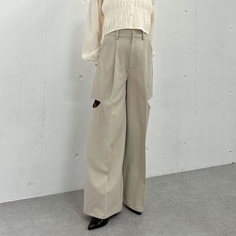 定番のスラックスもサイドにカットデザインを入れることでトレンドライクに。
