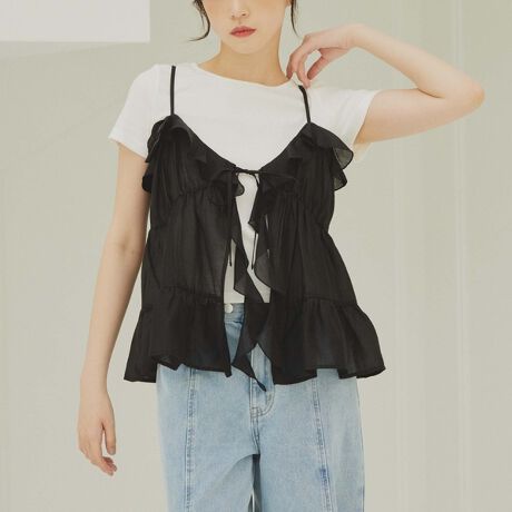 今年らしいラッフルフリルが特徴のキャミセットアイテム。
