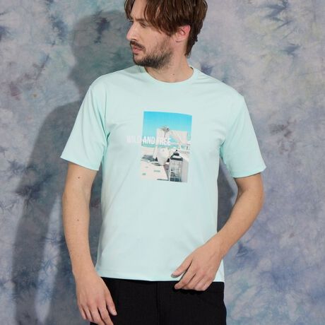 南欧をイメージしたグラフィックとロゴを大胆にプリントしたアラカルトクルーネックTシャツです。