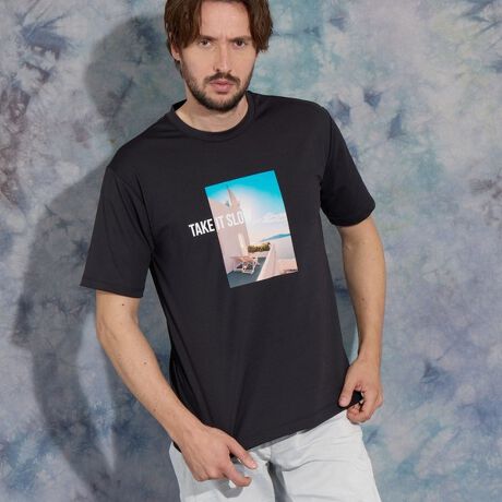 南欧をイメージしたグラフィックとロゴを大胆にプリントしたアラカルトクルーネックTシャツです。