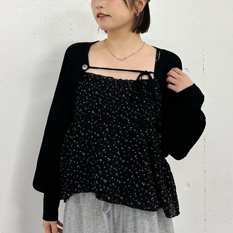 小花柄が可愛いキャミはポコポコとした立体感と胸元のシャーリングデザインが特徴。