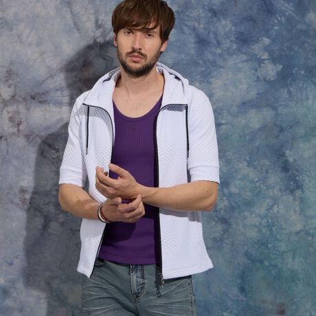 Tシャツやタンクトップの上から、夏でもサラッと羽織れるハイネック5分袖フルZIPパーカになります。