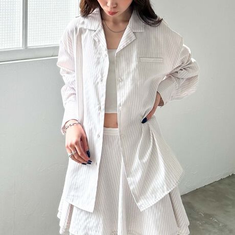 お洒落インナーと合わせシャツとしての着こなしはもちろん、同素材のミニスカートとセットアップでの着用でトレンドスタイルも叶います。