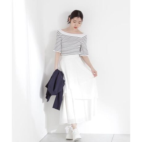 コットンボイルの柔らかい生地でふんわり感が溢れるティアードスカート。優しい風合いで程よいカジュアル感を演出します。後ろウエストはゴムなのでラクなはき心地。Tシャツやサマーニットにも合わせやすくてお勧めです。