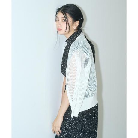 大好評!さらっとしたラメ糸を織り込んだ透かし編みのミドル丈カーディガン。シンプルなデザインながら、肌がほんのり透ける編地で、軽やかな印象に見せてくれます。ノースリーブの羽織にも夏の冷房対策にもお勧めです。