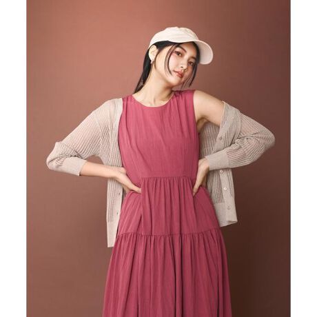 大好評!さらっとしたラメ糸を織り込んだ透かし編みのミドル丈カーディガン。シンプルなデザインながら、肌がほんのり透ける編地で、軽やかな印象に見せてくれます。ノースリーブの羽織にも夏の冷房対策にもお勧めです。
