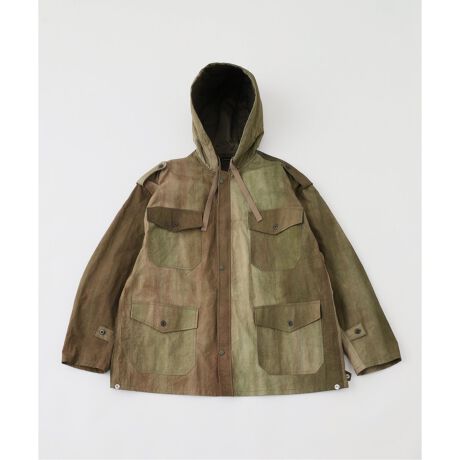 ・生地は、ナイロンの平織り素材を特殊なムラ染め加工を施し、カモフラージュ柄に見えるようにしています。フードや4つのポケットなどのディティールを活かすように程よいハリ感とマットな質感に仕上げています。