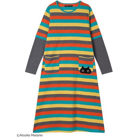 【ワンピース(ロング袖)】クリエーター“俣野温子”氏がデザインする、甘くなりすぎない大人かわいいテキスタイルとカラーで、くつろぎ時間を楽しく過ごせるパジャマ&ルームウェア・綿100%の天竺素材を使用・色鮮やかなマルチボーダーと袖の無地の切り替えが印象的・左ポケットにあしらった黒猫のアップリケがデザインポイント【サイズ詳細】M:身幅53.5cm 着丈110.0cm 身丈112.0cm 肩幅39.0cm 袖丈55.5cmL:身幅57.5cm 着丈110.0cm 身丈112.0cm 肩幅40.5cm 袖丈55.5cm※出来上がり寸法を表示しております※サイズ詳細の寸法には多少の差異がございます※アイテムによって柄の出方が異なりますのでご了承ください。