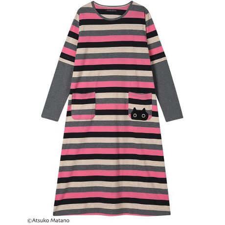 【ワンピース(ロング袖)】クリエーター“俣野温子”氏がデザインする、甘くなりすぎない大人かわいいテキスタイルとカラーで、くつろぎ時間を楽しく過ごせるパジャマ&ルームウェア・綿100%の天竺素材を使用・色鮮やかなマルチボーダーと袖の無地の切り替えが印象的・左ポケットにあしらった黒猫のアップリケがデザインポイント【サイズ詳細】M:身幅53.5cm 着丈110.0cm 身丈112.0cm 肩幅39.0cm 袖丈55.5cmL:身幅57.5cm 着丈110.0cm 身丈112.0cm 肩幅40.5cm 袖丈55.5cm※出来上がり寸法を表示しております※サイズ詳細の寸法には多少の差異がございます※アイテムによって柄の出方が異なりますのでご了承ください。