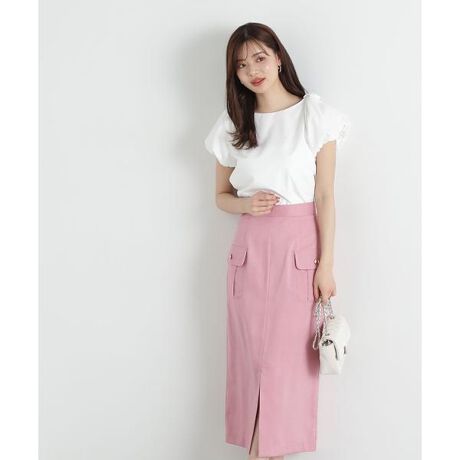 アウトポケットがポイントのナロースカートです。艶めくゴールドカラーのボタンがコーディネートを引き立てるデザイン。ややハイウエスト設定なので、スタイルアップを叶えてくれます。