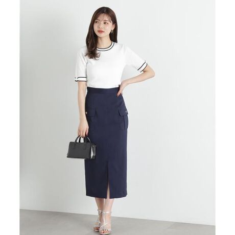 アウトポケットがポイントのナロースカートです。艶めくゴールドカラーのボタンがコーディネートを引き立てるデザイン。ややハイウエスト設定なので、スタイルアップを叶えてくれます。