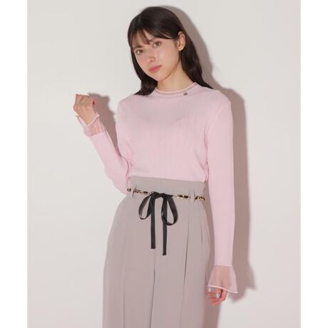 襟と袖のシアーがアクセントのフェミニンなニット。シアーな袖口はふんわり広がるフレアスリーブで、手元に華やかさを女性らしさをプラス。襟ぐりにはさり気ないシアーラインが入っているので、上品な抜け感を演出します。シンプルながらディテールにこだわった、大人のエレガントさを引き出すデザイン。程よく体にフィットするシルエットが美しいラインを引き立てつつ、快適な着心地です。スカートもパンツも相性が良く、オンオフ問わず様々なシーンで着ていただけます。※撮影時照明の関係により、色味が違って見える場合がございます。またパソコン・スマートフォンなどの環境により、若干製品と画像のカラーが異なる場合もございます。予めご了承ください。商品の色味は、商品単品画像をご参照下さい。※商品画像はサンプルのため、色味やサイズ等の仕様に変更がある場合がございますので、予めご了承ください。