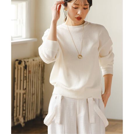 裾や袖のリブも敢えてスウェットライクな編立にしており、ラフに着られるようにこだわったポイント。大きすぎないサイズ感でありながら、さらっと着るだけでこなれ感が生まれるようにシルエットも完成されているのでアレンジ要らずでコーディネートを楽しめる万能な1枚です◎。