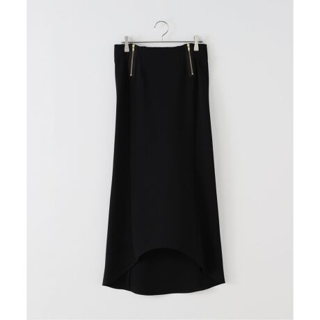 女性らしいボディラインを強調させたシルエット。裾部分は前後差があるデザインでタイトながらも足さばきが楽なフォルムです。ウエスト部分はゴムギャザーになっておりリラックス仕様。フロントのダブルファスナーもデザインポイントのひとつなので、インしての着用がおすすめ。