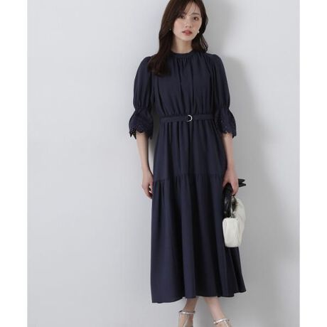 袖口まわりにあしらった刺しゅうが愛らしく映えるティアードワンピース。ウエストはゴム仕様で動きやすいです。シルバーバックル付きの共地ベルトでウエストマークをすると、メリハリ感ときちんと見えも叶えてくれます。